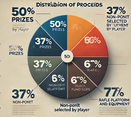37% Non-Profit Selected by Player: 37% of the proceeds are donated (passed through) to the non-profit organization chosen by the raffle participant when purchasing their ticket.